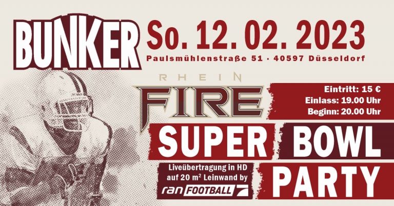Die RHEIN FIRE ran Super Bowl Party findet am 12. Februar im “Bunker Paulsmühle“ statt. Vor dem Highlight der Saison der besten Football Liga der Welt haben wir natürlich auch